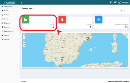 En este mapa se presentan las instalaciones que están conectadas en color verde y aquellas que no tienen conexión en color rojo. Si en alguna instalación existe una alarma activa, esto se indicará en este mapa mediante un circulo rojo que parpadea justo debajo de la instalación con alarma.