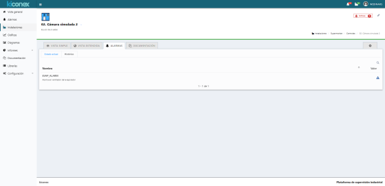 Independientemente del nivel de alarma, la plataforma mostrará cualquier alarma activa en el panel superior, junto al nombre de la instalación/control, en esta imagen tienes un ejemplo: