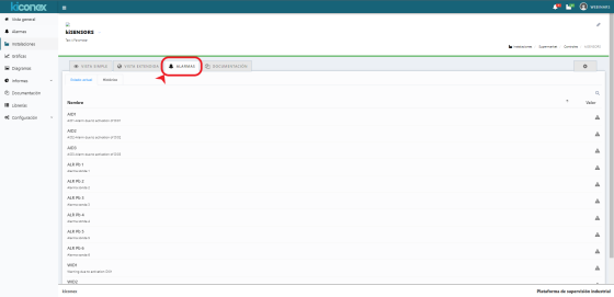 En kiconex existe una categoría “Alarmas” para aquellos parámetros de los controles que reflejan avisos o alarmas de la máquina conectada. Puedes encontrar estos parámetros accediendo al control, en la pestaña con el símbolo del engranaje.