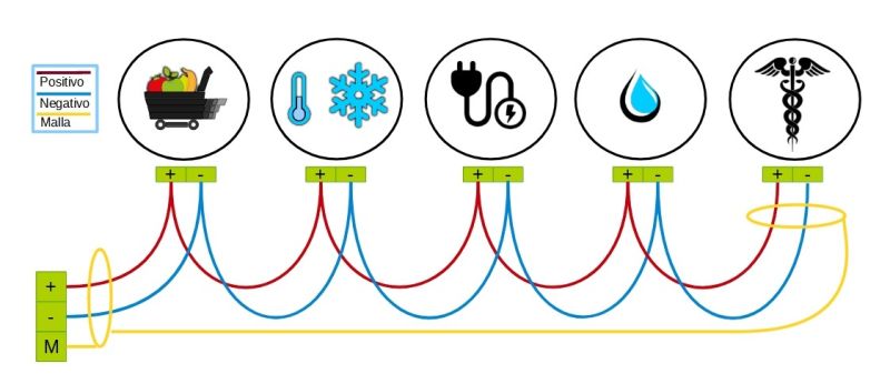 Deben estar conectadas entre sí utilizando el bornero del cuadro de kiconex o del kiBox como inicio o final de línea, nunca conectándose a las máquinas o equipos monitorizados, si la malla se conecta a una máquina la tensión que ésta pueda tener puede terminar siendo inducida en el bus de comunicación creando ruido y conflictos en él, incluido la rotura de uno o más puertos del kiBox.