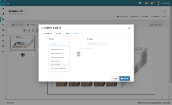 Tiene un desplegable donde podrá seleccionar las diferentes acciones que puede realizar este parámetro en cuanto se haga click encima de su área, se puede cambiar de capa, cargar diagrama, cargar instalación, cargar control o ir a un link externo.