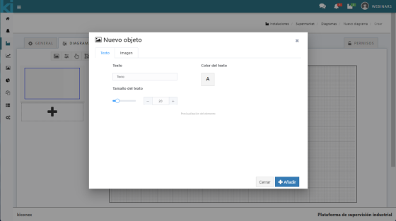 Al pulsar sobre el icono aparece un nuevo panel de nuevo objeto, aquí se puede cargar la imagen a utilizar para representar en el diagrama. Por ejemplo, un plano de la instalación donde se encuentren todos o algunos de los dispositivos a monitorizar, algún circuito de un equipo...entre otros.
