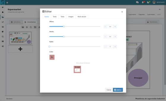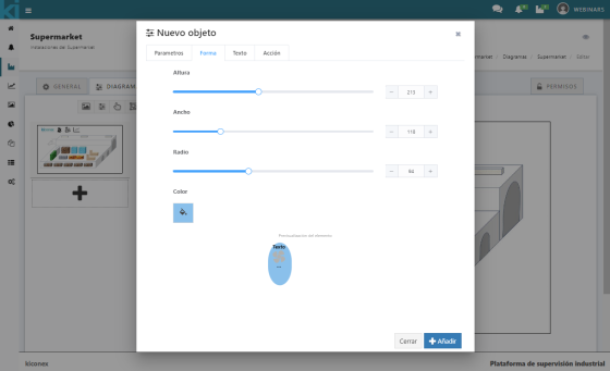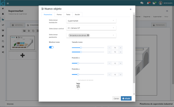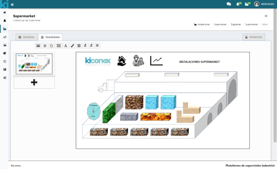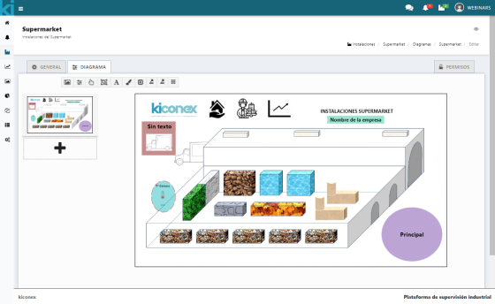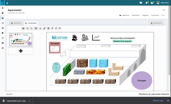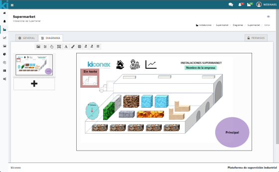 La configuración de estos diagramas se realiza directamente en la plataforma myKiconex de una forma fácil e intuitiva. Para ello se pueden incluir imágenes, variables analógicas, variables digitales, iconos dinámicos, botones de acciones, enlaces de cambio de capa...etc.