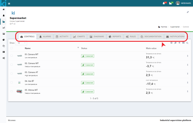 Si accedes a la pestaña de controles tendrás el listado de los equipos conectados al kibox, también verás sus parámetros principales y el estado en el que se encuentra cada control, estos pueden ser conectado, desconectado o desconocido. | |||