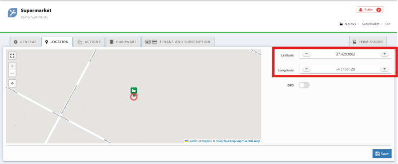 La ubicación permite geolocalizar la instalación manualmente mendiante datos de latitud y longitud. Esta configuración es de gran importancia, ya que la plataforma usa esta información para ubicar a la instalación en una zona horaria. Dicha zona horaria es usada para la visualización de históricos de datos en una gráfica o para las notificaciones de alarma, por lo que si no se configura, toda la información se muestra con la hora del Meridiano de Greenwich (GMT+0).