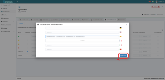 De está forma, el número de teléfono aparecerá en la fila del idioma elegido para notificar a ese usuario. Este proceso se puede repetir para añadir más usuarios a notificar en caso de activación de esta alarma. Finalmente, es necesario pulsar el botón "guardar" para que todos los cambios queden registrados en la plataforma.