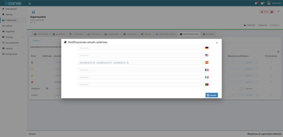 Aquellas instalaciones que en su plan incluyan las notificaciones por email podrán activar la funcionalidad de aviso de activación de alarmas mediante el envío de email a uno o varios usuarios.