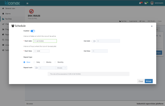 • Tipo de repetición: una sola vez, diaria, semanal, mensual. En los casos semanal y mensual, se solicitan los días/meses específicos donde se debe ejecutar la regla.