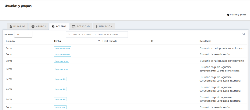 Muestra un registro de todos los accesos que ha habido en un rango determinado de tiempo sobre la lista de usuarios visible para el usuario en cuestión. Se muestra la fecha, el host e IP desde donde se ha realizado la sesión y el resultado del mismo.