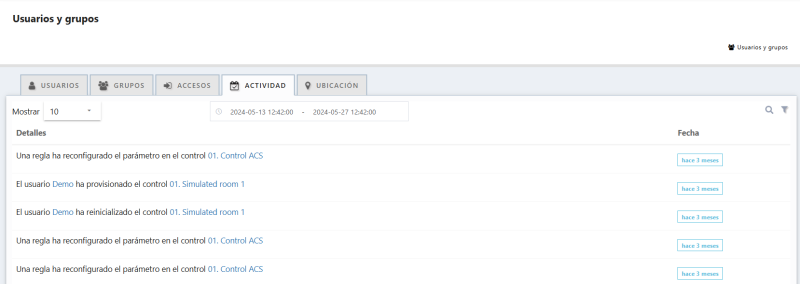 Muestra un registro de todas las acciones que se hayan realizado durante un periodo específico de tiempo sobre las instalaciones, usuarios y grupos a los que el usuario tiene visibilidad.